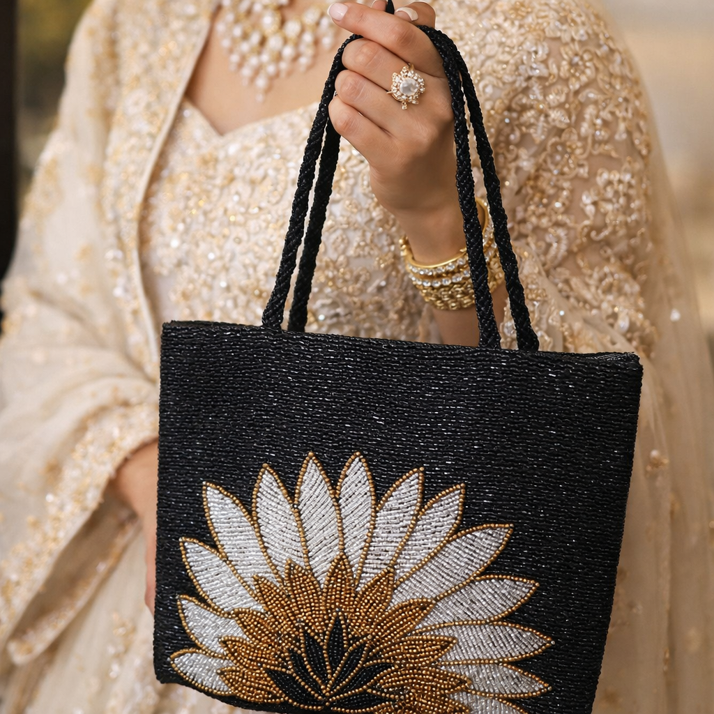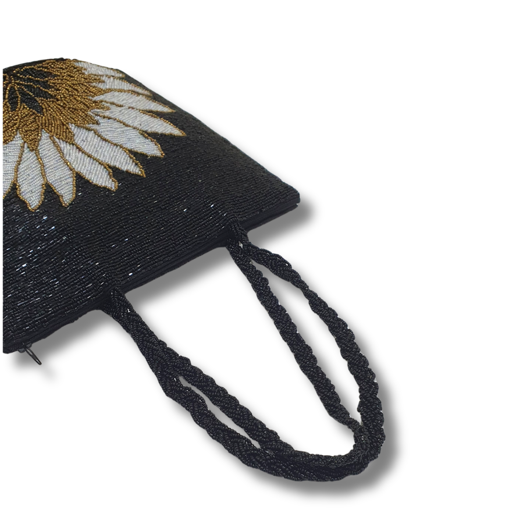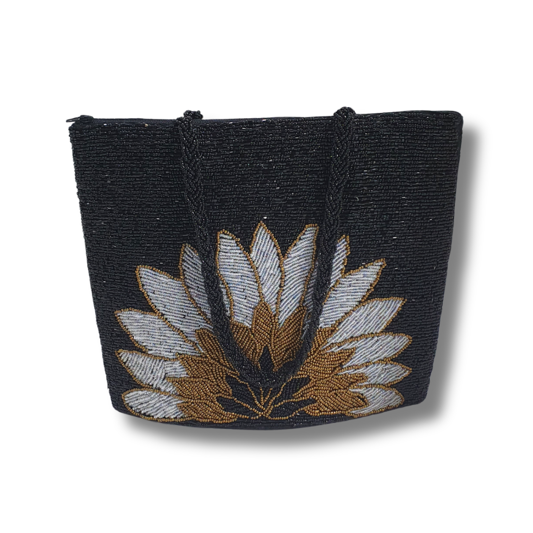 This elegant black beaded zipper bag is a perfect blend of sophistication and craftsmanship. Handmade with precision, each bead is carefully placed to create a stunning pattern, giving it a luxurious texture. The bag features a beaded handle, adding to its charm and making it a unique accessory for any occasion. Handcrafted with attention to detail, this bag offers both style and functionality, providing ample space while maintaining an elegant look. Ideal for evening outings, special events, or as a statement piece, this bag brings the best of handmade craftsmanship to your wardrobe.
