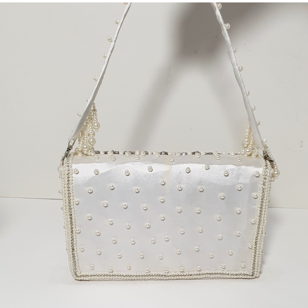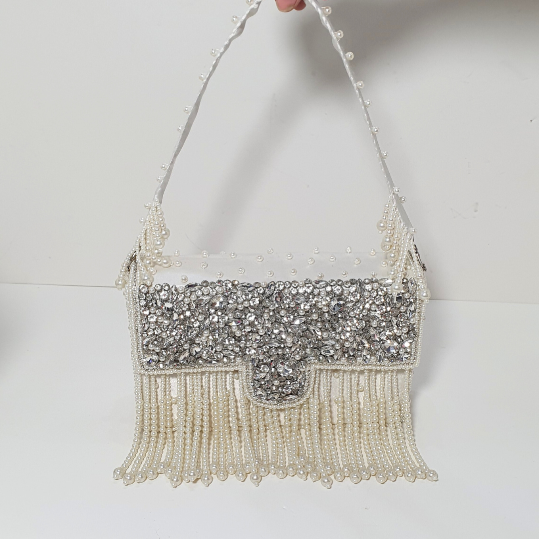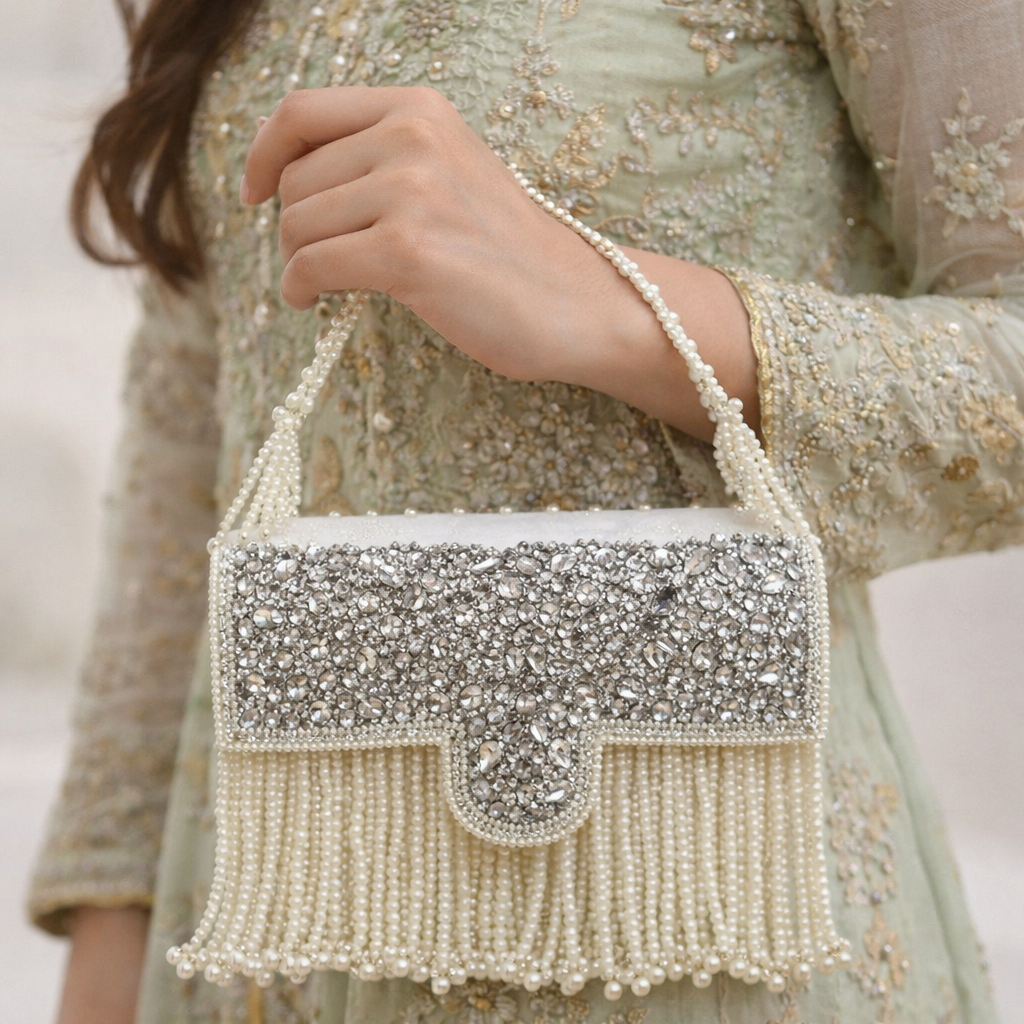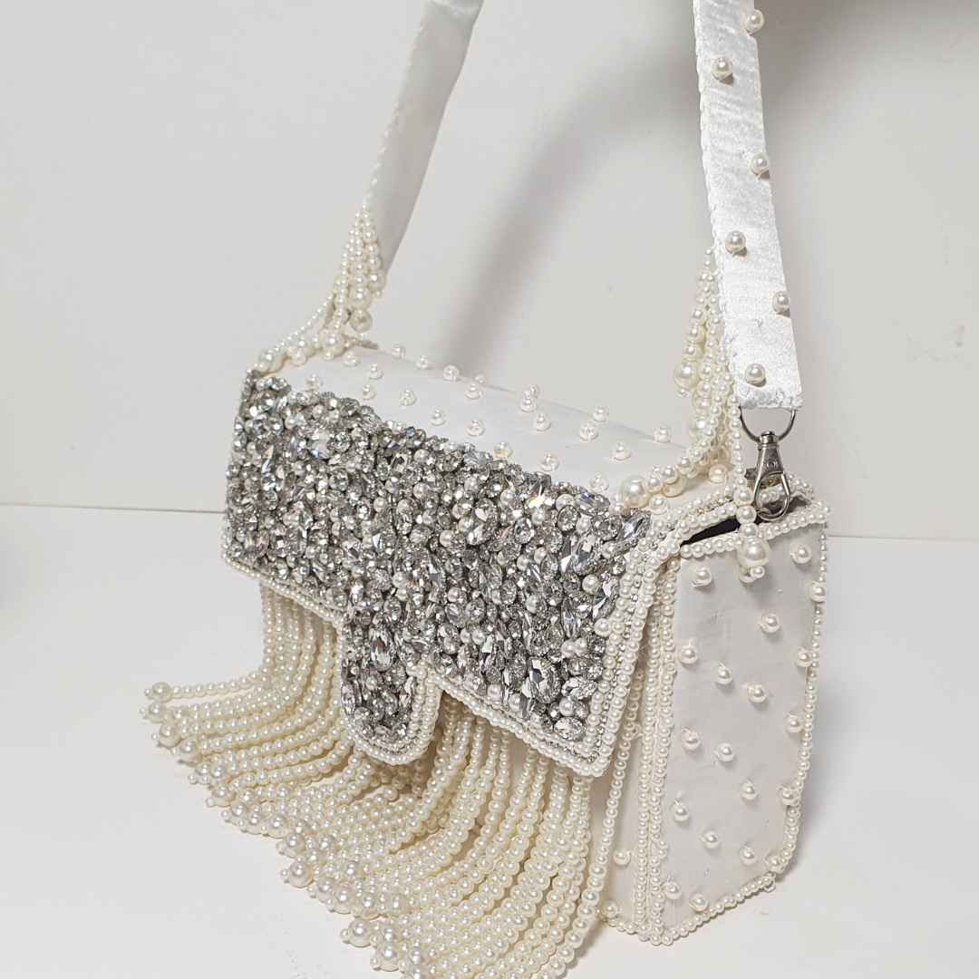 A white and silver fancy crystal stone bag designed to shine at every event. It features sparkling crystal stone embellishment with elegant pearl hangings that add a graceful, luxury finish. Lightweight yet eye-catching, this statement bag is perfect for weddings, parties, mehndi, baraat, walima, and formal dinners. Pairs beautifully with white, silver, pastel, and heavily embroidered outfits, making your whole look feel polished and premium.