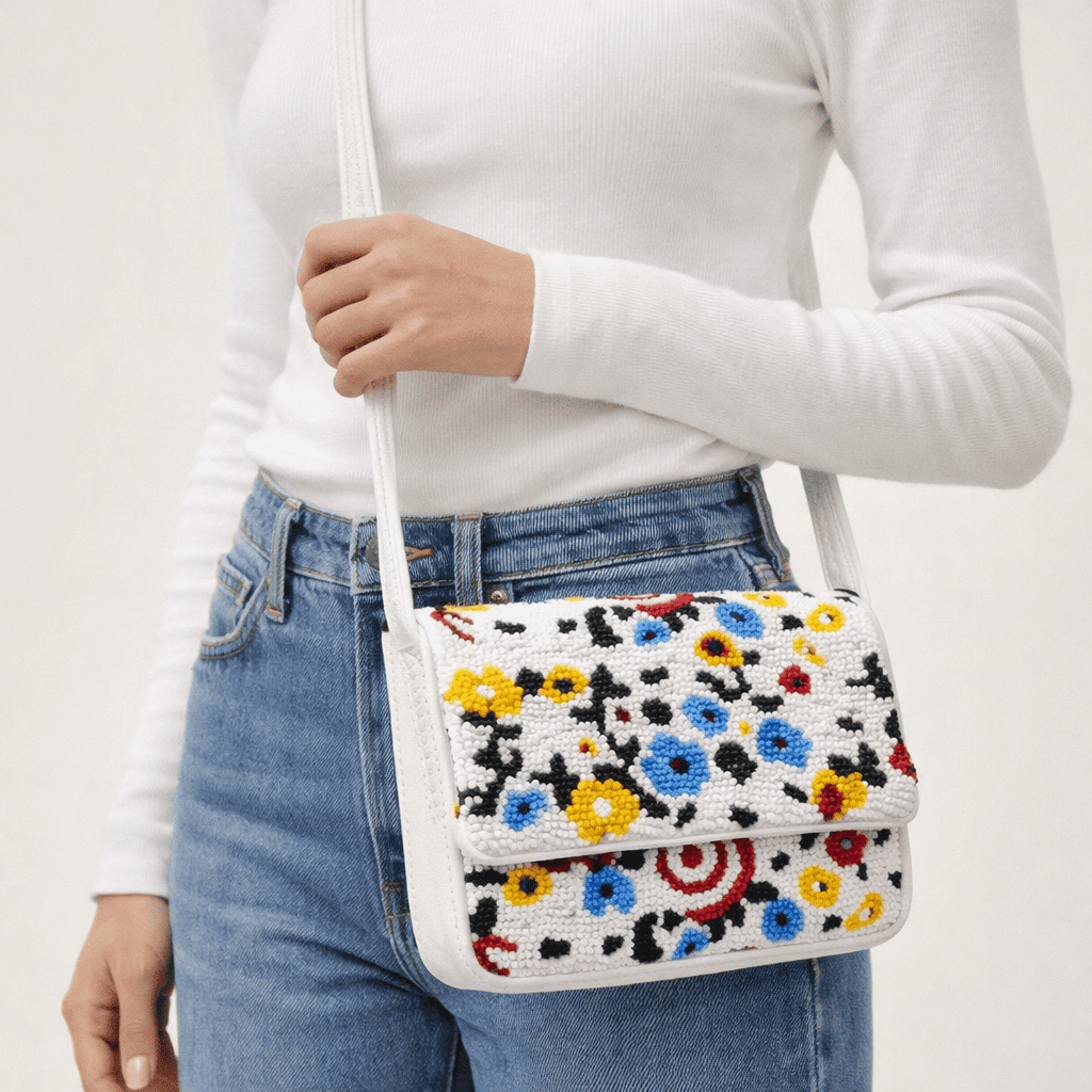 Introducing our beautifully handcrafted White Multi Shoulder Bag, a timeless statement piece designed with love and detailed artistry. This fully handmade bag features intricate multi-color beadwork on a soft white base, creating a graceful blend of elegance and vibrance.