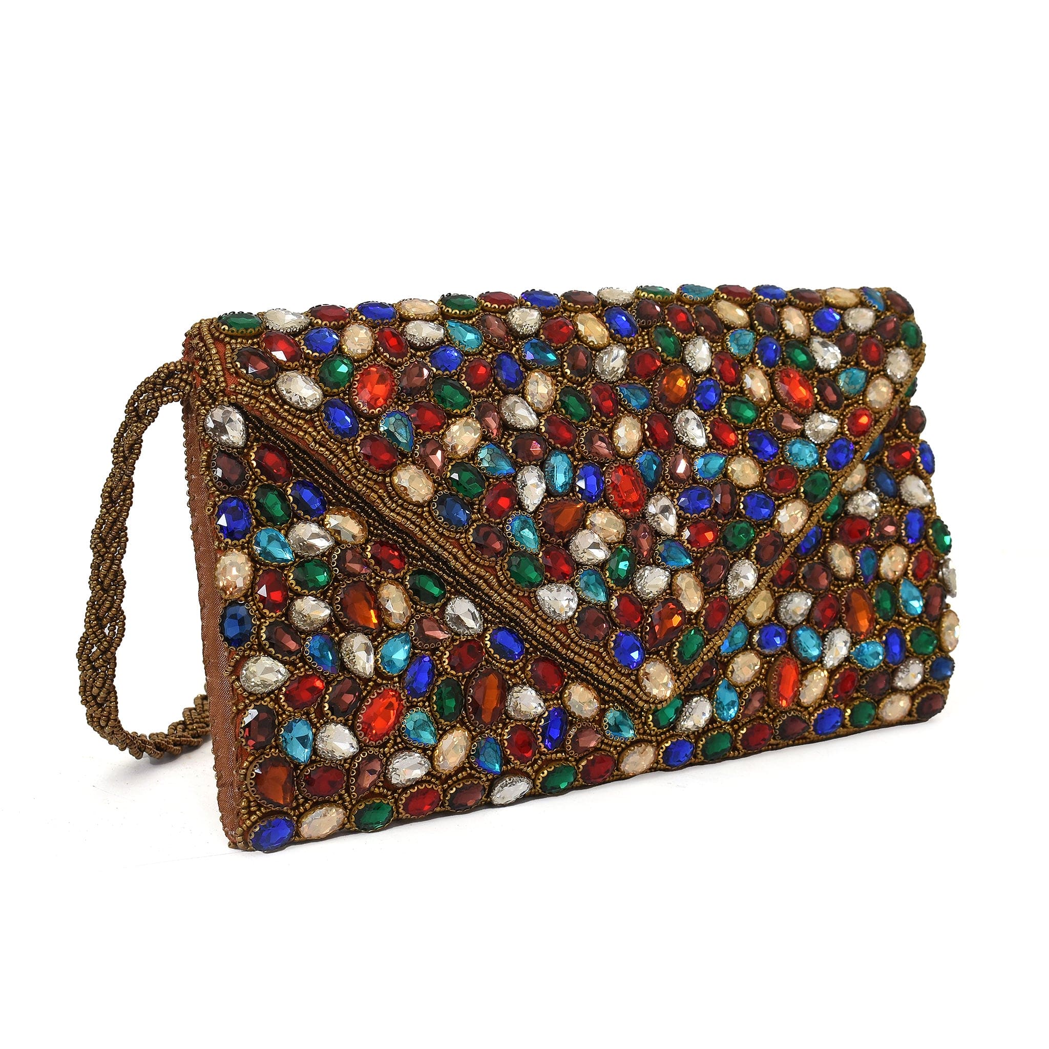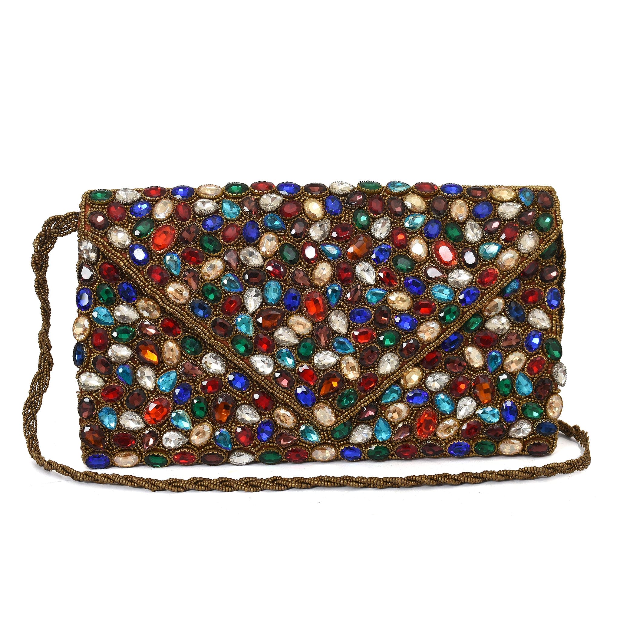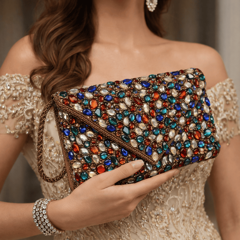 Handcrafted Perfection: Meticulously created by skilled artisans, this clutch is adorned with carefully placed multi-colored stones and beads, ensuring each piece is unique and eye-catching.